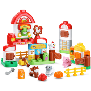 It's farming fun with the LeapBuilders® Food Fun Family Farm™! Build, create and learn with this interactive 50-piece farm-themed block set.