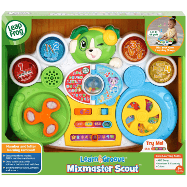 Remix learning songs and drop some educational beats with the Learn & Groove® Mixmaster Scout™. This musical toy includes 30 funky background tracks little DJs can scratch over and remix using the turntable and the light-up spinner.