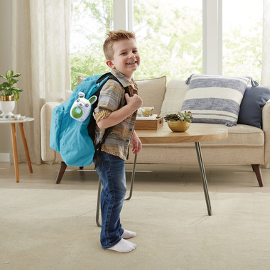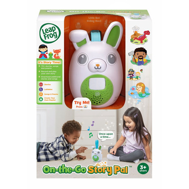The On-the-Go Story Pal player lets kids take story time wherever they go! Spark imagination through 70+ stories, poems, songs and lullabies. The narrators, character voices, sound effects and content encourage listening comprehension and build a foundation for a love of storytelling. This adorable, bunny-shaped player has easy-to-navigate controls and a headphone jack so kids can listen anywhere (headphones not included). Personalize the On-the-Go Story Pal by recording up to 10 minutes of your voice reading your childs favourite story or create your own. Create a playlist of up to five stories, songs, poems or lullabies. A timer allows you to select a variety of stories, songs and lullabies to be played before the player shuts off. Easy-to-navigate controls make it kid-friendly and simple to use. Includes a carrying strap so kids can bring the player anywhere they want to go. Free additional content is available for download and features four packs of additional stories and music. Play happily ever after! Intended for ages 3+ years. Requires 3 AA batteries. Batteries included for demo purposes only. New batteries recommended for regular use.