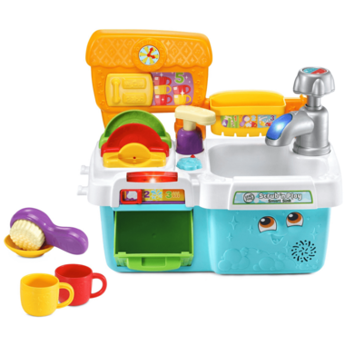 Soak up fun and learning with the Scrub 'n Play Smart Sink™. Pretend to wash the dishes in the sink and count from one to ten by adding the pretend soap. Learn about colours and sizes when matching the plates to their slots in the drying rack. Load up the dishwasher and choose the cycle.