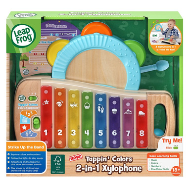 Get two instruments in one with the Tappin Colors 2-in-1 Xylophoneҙ! Bring learning to musical exploration with four interactive ways to play. Help kids build confidence as they follow the lights to learn how to play eight well-known tunes. Hear first words about numbers and colors, or play notes to hear xylophone, glockenspiel and strings sounds. Jam along to nine original tunes! Hand the removable tambourine to a friend, then tap the xylophone with the mallet and play together. Two double-sided music cards and eight light-up keys make it a snap to tap out a tune. Tuck the music card into the tambourine, and the tambourine into the xylophone, for a handy-dandy music stand. When playtime is done, the mallet attaches to the bottom of the xylophone, and the music cards store in the tambourine. This product is made with 100% FSC-certified wood that comes from well-managed forests.