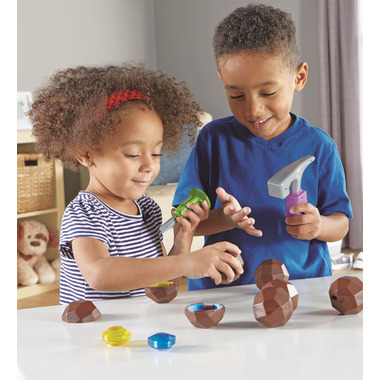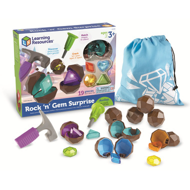 Crack open a colorful gem surprise! Little ones get a no-mess introduction to sorting, matching, and counting with the play geodes and gems of Rock 'n' Gem Surprise from Learning Resources. Using the included play hammer and chisel, kids can crack open each reusable play geode and discover the translucent plastic gemstones inside.