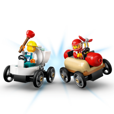 - TOY FIGURES & PLAYSET: Everything boys and girls need to build a toy car ramp, hot dog and toilet soapbox cars, plus 4 minifigures including a hot-dog vendor and plumber drivers