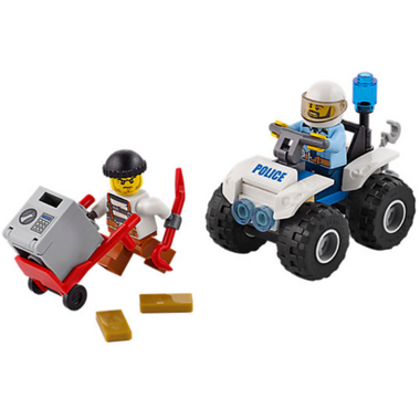 Be part of the action with the LEGO® City police as they keep the city safe, featuring a police ATV and pair of handcuffs, plus a two-wheeled hand truck and safe with opening door, gold bars and a crowbar. Includes two minifigures.