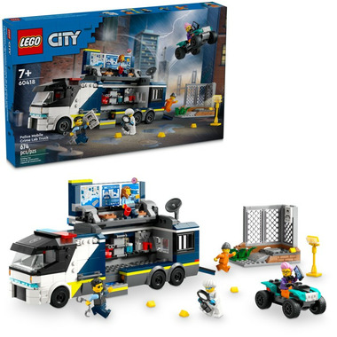 Investigating clues left by crooks on the run is a job for the officers of the toy LEGO City Police Mobile Crime Lab Truck (60418). This cool playset for kids aged 7 and up features a toy truck that opens to reveal a 2-level crime scene lab with workstations, a map, CCTV screens, a microscope, coffee machine and a jail. The set also includes a forensic scene and the crooks' quad bike. Just add the 2 police, 1 scientist and 2 crook minifigures for epic adventures! This LEGO City Police vehicles toy playset includes a step-by-step printed building guide and 3D instructions in the LEGO Builder app a digital building companion with intuitive zoom and rotate tools that enable kids to visualize models from all angles as they build. Your City, No Limits! LEGO City sets feature cool vehicles, realistic structures and fun characters that inspire imaginative play without limits. Kids can add this police playset to others (sold separately) in the LEGO City range for a whole world of play.