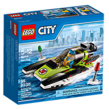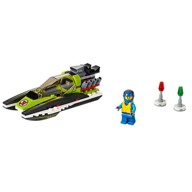 Take the lead and win the race behind the controls of the LEGO® City Race Boat, featuring a streamlined design, removable cockpit windshield and big engines, plus 2 buoys and a race boat driver minifigure.
