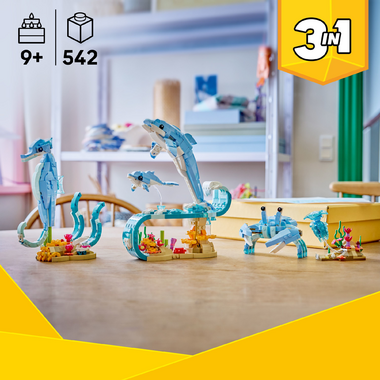 LEGO Creator 3 in 1 Sea Animals: Beautiful Dolphins (31385) building set lets kids ages 9 and up play out fun-filled stories. This sea animal figures playset for girls and boys offers 3 different building options with the same set of bricks. They can choose to build a dynamic model of an adult and baby dolphin with posable features riding a cresting wave above coral. This can then be rebuilt into a posable seahorse on a colorful stand featuring seaweed and a posable clam, or a crab next to sea plants and a jellyfish. Once playtime is over, each beautiful model can be proudly displayed as beautiful nature decor on a shelf or desk. This LEGO Creator 3 in 1 set will inspire young imaginations and makes a great gift idea for kids who love sea animals. They can build each playset with confidence using the LEGO Builder app zoom, rotate in 3D and track progress with easy-to-follow digital instructions. Please note models cannot be built simultaneously.