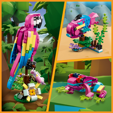 • 3in1 exotic animal toys Kids aged 7+ can step into a rainforest with the LEGO Creator 3in1 Exotic Pink Parrot (31144) playset, featuring a parrot, a fish and a frog