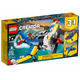Creator 3in1 31094 Race Plane, featuring a blue, white, yellow and red colour scheme with cool racing stickers, visible detailed engine with pipes and cylinders, fixed landing gear, large aircraft propeller, sporty hinged wings and adjustable tail elevators. This impressive toy airplane also features an opening cockpit and comes with a pilot minifigure, complete with a printed flight suit and a helmet. With LEGO Creator 3in1 sets you get 3 different build and play experiences. Build this propeller plane toy and then rebuild it to create a toy helicopter or a toy jet for more aerial action and adventure.