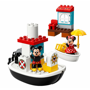 Includes 2 LEGO Duplo figures: Disney’s Mickey Mouse and Minnie Mouse.  Features a steamboat with a brick decorated as a steering wheel and a pulley function, plus a pier with an opening window, chair and festive lighting decoration. Accessory elements include a rowing boat, camera and a parasol. Set sail with Mickey Mouse on his amazing steamboat, and help him use the camera element to pretend to take pictures of the boat parade.