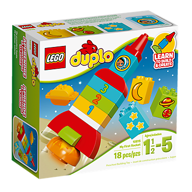 Learn to build and create by stacking chunky LEGO® DUPLO® bricks to make a colorful rocket and a planet—there are building cards inside for inspiration. Encourage role play and help your child to develop early counting skills by matching bricks decorated with a moon, 2 planets and 3 stars with the corresponding number bricks. DUPLO bricks are specially designed to be safe for little hands.