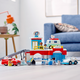 - Includes 4 DUPLO figures - 2 men, a grandmother and child, plus a dog and fun features such as a drive-through car wash with a fabric cleaning curtain, a movable boom barrier and a ticket machine