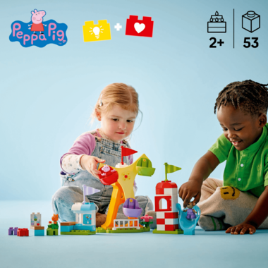 Bring the magic of Peppa Pig's world home with the LEGO DUPLO Peppa Pig Funfair toy (10453). Perfect for preschoolers ages 2 and up, this colorful carnival playset features a rotating Ferris wheel, exciting slide, and juice bar where favorite characters Peppa Pig, Candy Cat, and Danny Dog can enjoy refreshments. LEGO DUPLO bricks are specially designed for small hands to help little ones develop essential skills through play. Toddlers match colors as they pair characters with ferris wheel gondolas, practice motor skills while placing figures in rides, and build confidence as they explore new imaginative experiences. Intuitively designed to encourage toddlers to explore emotions and social interactions while creating their own funfair adventures, This high-quality learning toy helps little ones reach important developmental milestones through hands-on play with recognizable Peppa Pig characters. Contains 53 pieces.