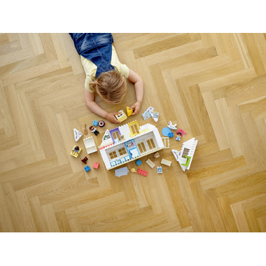 This colorful, contemporary dollhouse for toddlers provides many opportunities to play and learn. Teach toddlers about everyday life, such as cooking, mealtime and bedtime routines as you both share imaginative role-play fun. There's mom, dad and child figures, plus a pet dog and a teddy bear – all designed to inspire a comforting emotional attachment in toddlers. Filled with familiar details and infinite fun, you’ll share endless precious developmental moments as you explore play possibilities together. For even more fun, you can rebuild the same pieces as a tower house, and then again as a residential house!