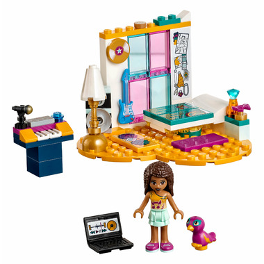 Includes an Andrea mini-doll figure, plus a Pepper the parrot figure. Features a bed that folds up to create a dressing area with mirror, plus a piano, lamp and a speaker. Accessory elements include a microphone, headphones, perfume bottle and a cookie. Help Andrea hone her musical talents by practicing and rehearsing in her bedroom.