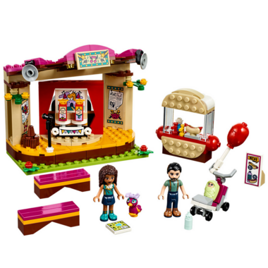 Take center stage for an afternoon of performances in Heartlake City Park, starting with a puppet show! Help the dad and his baby sit down on a bench to watch the show, then press the piano keys at the back of the stage to help the puppets move about! Afterwards, rotate the stage background to help Andrea and her pet bird Pepper put on a beautiful musical performance together. Then head to the hot dog stand for a snack after the show.