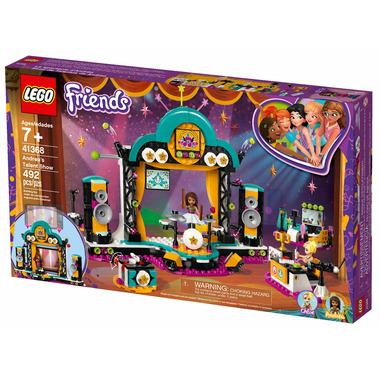 Includes 2 mini-doll figures: Andrea and LEGO Friends Chloe, plus a rabbit figure Features a main stage with rotating speakers, plus 3 separate rotating mini sets, 2 backstage areas, a judging panel with flag functions and voting button, a stand to attach a cell phone, fireworks function and a magician's box Accessory elements include toy microphone, magic trick set, camera, hairbrush, lipstick, cup, cell phone stand and a fabric skirt for Andrea to change in to Magician accessory elements include magician?s cape, magic card, hat, wand and toy rabbit Ages 7+