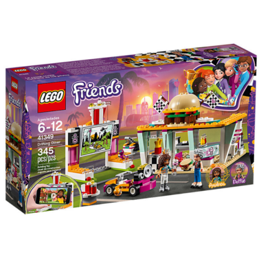 Drifting Diner has a burger grill, takeout window with cash register, stylized car-shaped table with bench, and an amazing giant burger icon on the roof. Outside there’s a giant screen for drive-in movies with handy side tables—stand your own cell phone or tablet in front of the movie screen to play real videos for the mini-dolls. You'll also find Andrea's go-kart and a go-kart launcher in this retro LEGO Friends set.