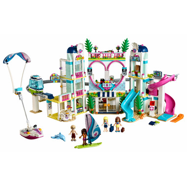 Heartlake City Resort is the place to hang out and have fun in Heartlake City! The hotel has a lobby, restaurant, juice bar, terrace with a DJ stand and 2 bedrooms. Drive the monorail round to the water park with changing room, 2 water slides and a splash bucket, plus a beach area with a water scooter, parasailer and a lifeguard stand. This amazing LEGO Friends set includes 4 mini-doll figures plus a dolphin figure.