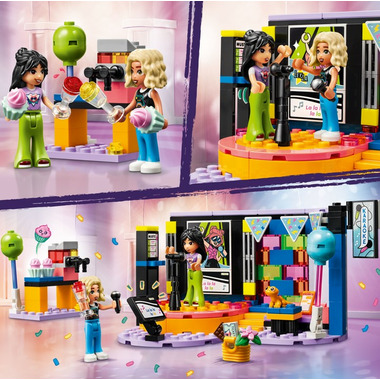 - Play out a fun karaoke singing party LEGO Friends Karaoke Music Party toy for girls, boys and kids aged 6 plus with 2 mini-dolls, a pet gecko figure, a revolving stage plus lots of accessories