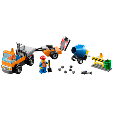 Includes a road worker minifigure. Features a Road Repair Truck with minifigure cab, open back for tools, plus a detachable trailer with ramp and cement mixer, Drop the ramp on the trailer to unload the cement mixer. Spin the barrel of the mixer to make the Ȕcement', then spread it in a pothole with the shovel. Accessory elements include a jackhammer, shovel, trashcan, barrier and 6 cement elements. This toy for boys and girls is an age-appropriate build and play experience for ages 4-7.