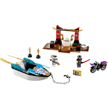 Includes Zane and Chopper Maroon minifigures. Features a temple with ramps, a dock, spinning knives and snake obstacles, treasure map with stand and decorative staffs above the archway that double as secret weapons. Also includes a motorbike and a boat with turning wheel, chain with hook, ice bolts and golden staff elements that double as secret weapons. The boat floats!