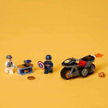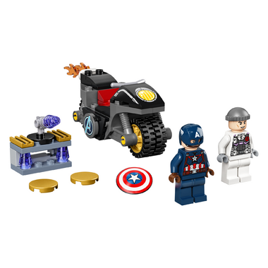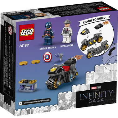 - Includes Captain America and Hydra agent minifigures, plus a buildable motorcycle and a disc shooter with detachable blaster