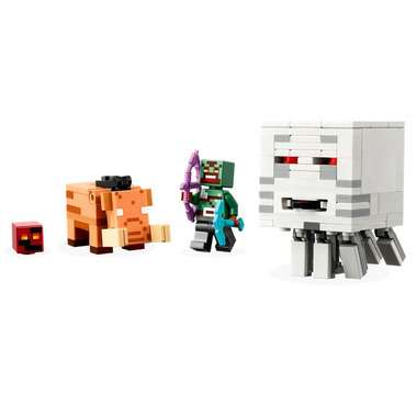 • Minecraft battle scene and action figures - Includes an Orc Warrior figure, a Minecraft ghast that shoots discs from its mouth, a hoglin figure, with its butting head, and 2 magma cubes