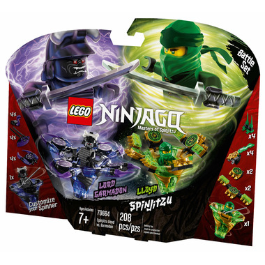 Stage a battle between the good son and evil father with LEGO® NINJAGO® 70664 Spinjitzu Lloyd vs. Garmadon. This ninja toy features Green Ninja Lloyd’s Spinjitzu Tornado of Energy and Lord Garmadon’s Spinjitzu Tornado of Destruction spinner toys, each with a new-for-January-2019 spinner element and 3 attachments for attack, defense and speed modes. Try different techniques with these cool NINJAGO spinners, create your own challenges and compete against your friends—the possibilities are endless. This LEGO NINJAGO set includes Lloyd and Lord Garmadon minifigures with katanas, plus 6 buildable display racks for attachment weapons and elements.
