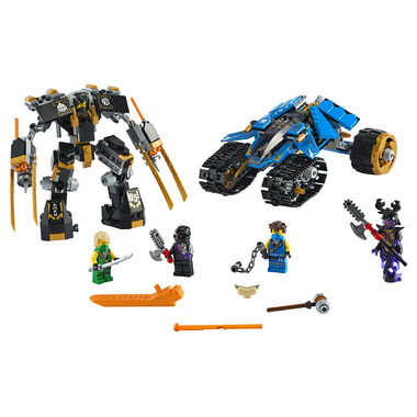- Detach the LEGO? NINJAGO? mech to reveal 2 missiles. The mech has a spring-shooter in each arm ready to fire and the ninja action figures have an array of weapons: Lloyd has a silver katana and Overlord has a chainsaw.