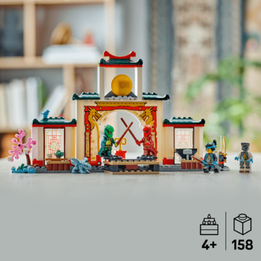 The LEGO NINJAGO Ninja Spinjitzu Temple (71831) toy for girls and boys ages 4 and up is based on season 3 of the NINJAGO Dragons Rising TV show. This dragon toy inspires little ones to play out character roles and scenes from the series. This set includes a NINJAGO tournament stage, garden, teahouse and weapons training area to inspire imaginative play. This LEGO NINJAGO set comes with 4 minifigures: Zane, Nya, Kai and Lloyd, plus a Baby Riyu dragon toy so kids can act out different roles. The minifigures can be placed on 2 turning plates for epic battles, and for added play value, there is a large range of accessories including 2 swords, 3 staffs, a hammer, a bird, a frog, a trophy, a cookie and a letter. The LEGO NINJAGO toy figures & playset also comes with a starter brick a partly constructed base that helps kids get building quickly for an interactive experience. Contains 158 pieces.