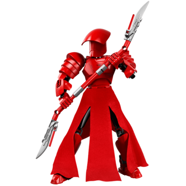 - Buildable and highly posable Elite Praetorian Guard figure features red armor with chest and arm decoration, textile skirt, lever-activated moving arms and a double-handed bladed staff that splits into 2 single-handed weapons.