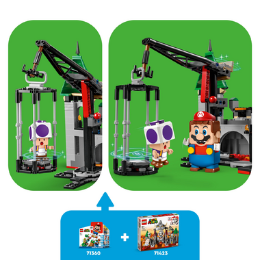 - Rescue mission Explore the castle with LEGO Peach֙, LEGO Marioor LEGO Luigi(figures not included) and use the crane to rescue the Purple Toad from the trap and topple Dry Bowser