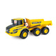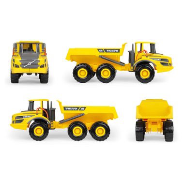 Toy vehicle as a detailed model of the Volvo A25G in yellow and black, with 6 wheels and tilting cargo compartment, so every child becomes a proud dumper driver.