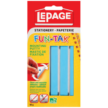 Fun-Tak Reusable Adhesive replaces glue, tacks, tape and pins to hang just about any light item such as posters, photos, and notes. Leaves no stains, no holes, no marks. Adhesive is long-lasting and doesn't dry out. Has hundreds of uses around the office, home or classroom.