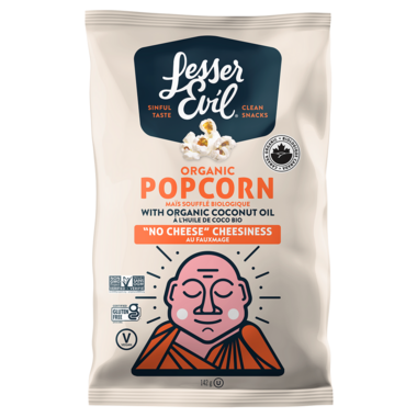 LesserEvil Organic Popcorn No Cheese Cheesiness is organic popcorn with organic coconut oil.