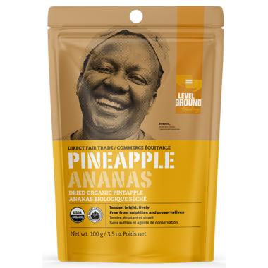 Dried fair trade and organic pineapple is tender, bright and lively! It is also free from sulphites and preservatives.