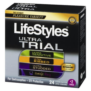 Lifestyles Ultra Trial Lubricated Latex Condoms contain natural rubber latex and, if used correctly, will help reduce the risk of pregnancy, transmission of HIV infection (AIDS) and other sexually transmitted infections. Each condom is tested electronically and conforms to Canadian standards.