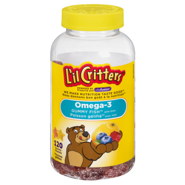 One serving contain 32-mg of Omega-3 DHA and these gummies also include antioxidant vitamins C and E. Plus, L'il Critters Omega-3 Gummy Fish have naturally sourced Cherry, Lemonade and Strawberry Lemonade flavours and no high fructose corn syrup, synthetic dyes or gluten. These delicious gummy vitamins have no chalky aftertaste. No wonder kids love em and parents trust them. L'il Critters has been infusing fun into children's nutrition with its full line of delicious kid's gummy vitamins and supplements since 1998.