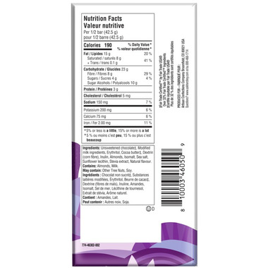 Unsweetened cocoa, cocoa butter, erythritol*, inulin, dextrin*, organic rBST free whole milk powder, dry roasted almonds, rBST free milk fat, sea salt, organic soy lecithin, vanilla extract, stevia extract