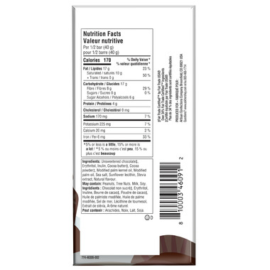 Unsweetened Chocolate, Erythritol, Inulin, Cocoa Butter, Sea Salt, Organic Soy Lecithin, Sunflower Lecithin, Vanilla Extract, Stevia Extract