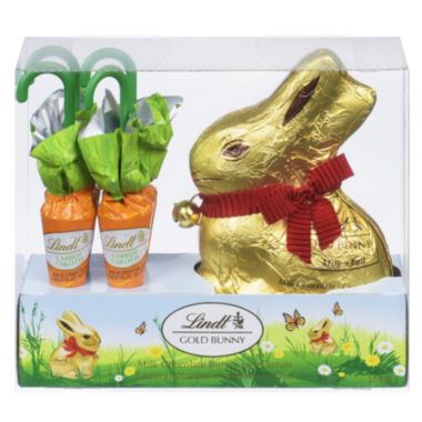 gift box features the milk chocolate Lindt Gold Bunny & Carrots.
