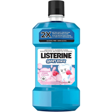 New look, same cavity protection! Help kids fight cavities and create strong oral health habits with Listerine Smart Rinse Bubblegum Kids Mouthwash. Formulated for children ages six and older and validated by the Canadian Dental Association to protect against cavities, this anticavity fluoride rinse provides 2x better cavity protection versus brushing alone. The rinse fights cavities even in hard-to-reach places brushing may miss, tints and removes food particles and debris, leaving proof in the sink of a cleaner mouth. The alcohol-free rinse also kills bad breath bacteria and freshens breath.; Kids are also sure to love the bubblegum; flavor. For best results, after brushing, kids should vigorously swish 10mL (2 teaspoonfuls) of the rinse between teeth for one minute. Made in a child-resistant package.