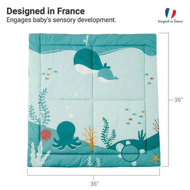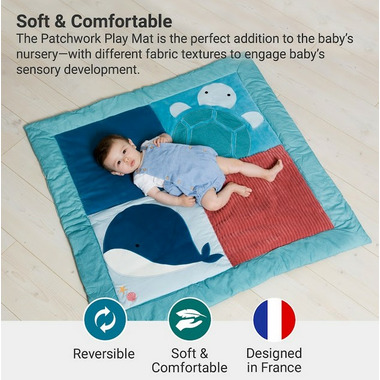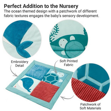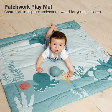 This Patchwork Play Mat is the perfect addition to the baby's nursery. The ocean themed design with a patchwork of different fabric textures engages the baby's sensory development.