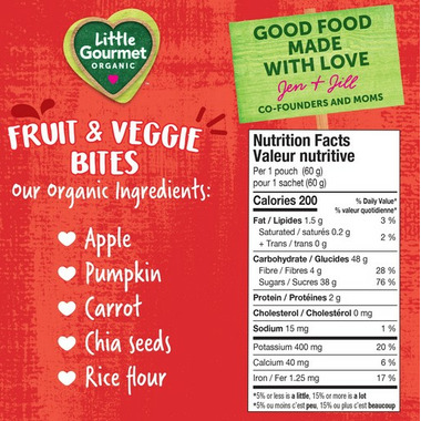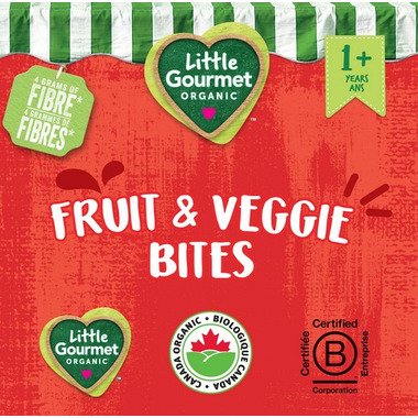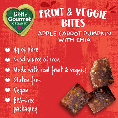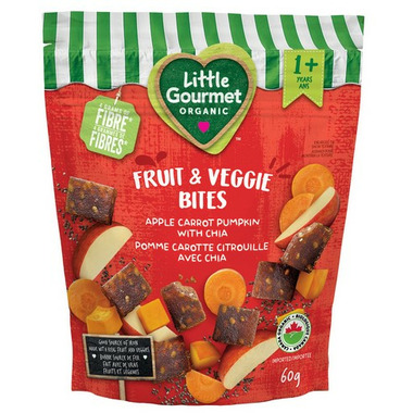 Little Gourmet fruit and veggie Bites are irresistible on-the-go organic snacks made with nutritious ingredients providing 4g of fibre. Bite-size yumminess made with chia, apple, carrot and pumpkin.
