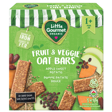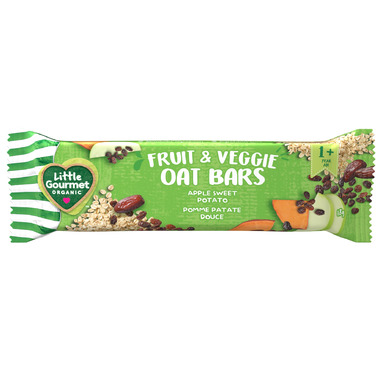 Little Gourmet's organic oat bars are the perfect on-the-go toddler snack, made for self-feeders 12 months and older. A delicious and nutritious toddler snack made with real fruit and veggies, and without artificial ingredients or flavours. Little Gourmets Apple sweet potato oat bars provide a source of iron with a flavourful combination of gluten-free oats, apples, sweet potatoes and carrots. An easy nutritious and mess-free snack to take to the park, add to a snack bag or preschool lunch or eat just about anywhere!