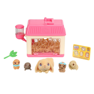 Includes: 1 x Hutch Playset, 1 x Mama, 2 to 4 x Surprise Babies, 2 x Baby Accessories, 1 x Water Bottle, 1 x Feeding Accessory, 1 x Paper Nesting Material, 1 x Birth Certificate, 1 x Instruction Booklet