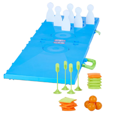 - 5-IN-1 FUN. Designed with 5 games in 1: Cornhole, Bowling, Tic Tac Toe, Skeeball, & Lawn Darts