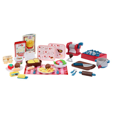 - 33 REALISTIC ACCESSORIES. This cooking role play set includes a pasta machine, ravioli stamp, stove with cooking sounds, pasta pot, wooden butcher block, salad bowl, lettuce, tomato, onion, tongs, breadbasket, pieces of toast, jumbo meatballs, cannoli shells, 2 placemats, 2 plates, 2 forks, 2 knives, chef knife, rolling pin, butter container with Make-It! Mix play sand, mozzarella cheese container with Make-It! Mix play sand, tomato container, tomato mold with Make-It! Mix play sand, egg carton with Make-It! Mix play sand, pasta flour bag with Make-It! Mix dough, cannoli cream container with Make-It! Mix fluff, and 2 detailed recipe cards.