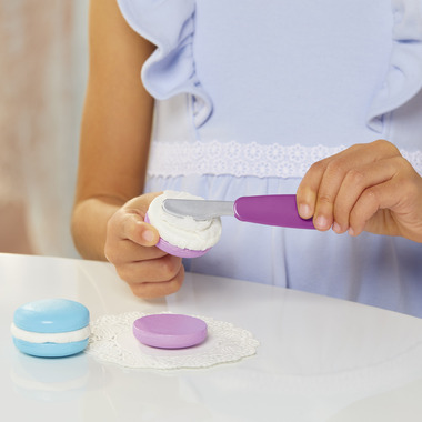 • 30 REALISTIC ACCESSORIES. This cooking role play set includes 2 color-change tea cups with saucers, tin with tea bags, macaron shells, macaron filling bag with Make-It! Mix fluff, cake frosting container with Make-It! Mix play sand, cake pan mold, cake spreading knife, cake mix bag with Make-It! Mix play sand, hibiscus flowers, frosting top mold, flower cookie cutter, cookie mix bag with Make-It! Mix play sand, and detailed recipe card.